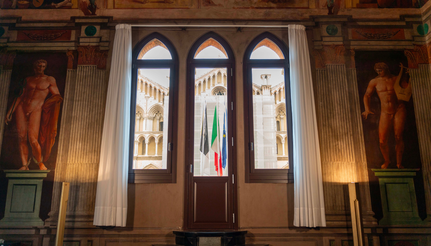 “Il serramento scelto non poteva che essere Europa - spiega Marco Pavanello, responsabile marketing e vendite della Pavanello Serramenti - perché le sue linee classiche si sono sostituite con discrezione alle finestre precedenti, rivoluzionando allo stesso tempo le performance garantite dai serramenti. In particolare, la posa delle due finestre e della portafinestra affacciate sul terrazzo della Sala dell’Arengo ha richiesto un intervento edile che ci ha permesso di eliminare i ponti termici senza perdere luce, mantenendo cioè i fori delle finestre della stessa dimensione. Con i nuovi serramenti si contrasta l’umidità e la formazione di muffe nel Palazzo, proteggendo così gli affreschi novecenteschi della Sala”.