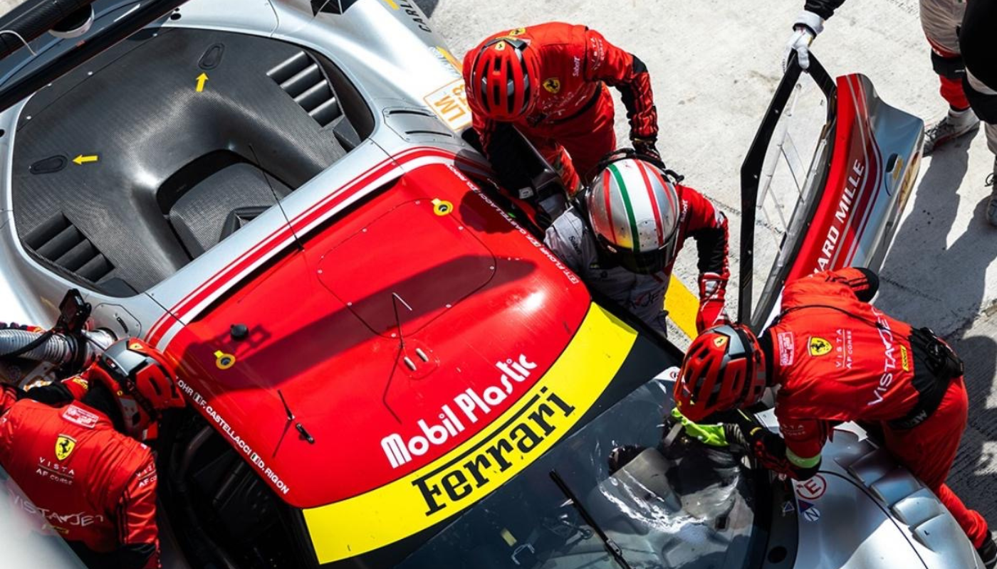 Sulla Ferrari di Simon spicca, in uno spazio privilegiato e di grande visibilità, il brand dell'azienda di Confienza (Pavia), attiva nello stampaggio di materie plastiche.