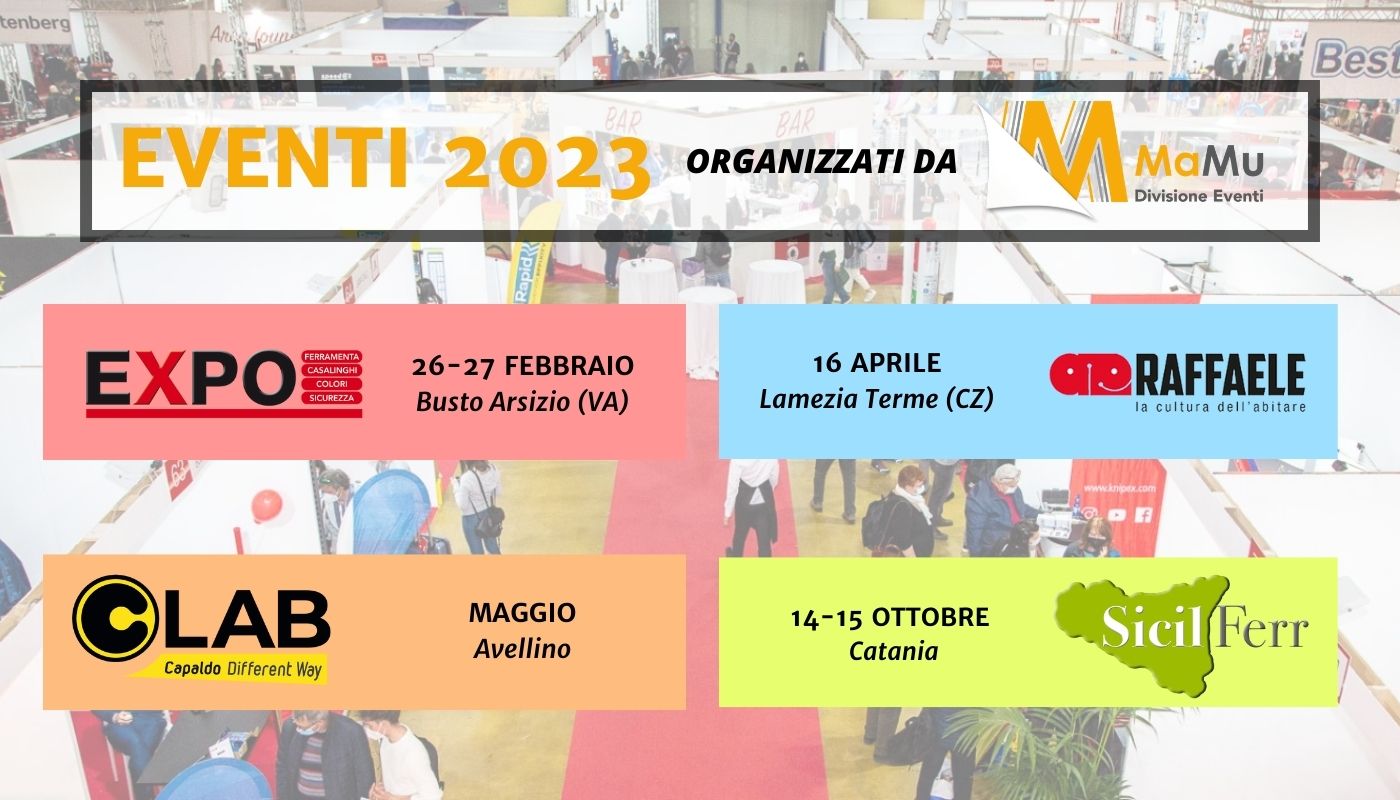 Da nord a sud, saranno tante le opportunità di networking, di confronto e di business per produttori, distributori, agenti e punti vendita. Il primo appuntamento sarà quello di Expo Machieraldo, giunto alla sesta edizione e organizzato il 26-27 febbraio nuovamente a Busto Arsizio, in provincia di Varese. A seguire, il 16 aprile a Lamezia Terme si svolgerà l’evento di Raffaele Spa. Torna nel 2023 anche il CLAB di A.Capaldo Spa, in programma nel mese di maggio. Chiuderà l’anno, la terza e attesa edizione della fiera SicilFerr, di proprietà di Ma.Mu stessa, che si terrà come sempre a Catania, ma in una location da record.