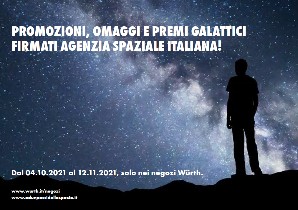 Dal 4 ottobre 2021e fino al 12 novembre 2021 ogni Würth Store, tra i 190 presenti in Italia, propone a tutti i clienti un’attività promozionale, denominata A due passi dallo spazio. Nel corso di questo periodo, esclusivamente in negozio, con una spesa minima di 99 € in negozio, i clienti possono partecipare ad un concorso a premi che mette in palio migliaia di premi fisici facenti parte del merchandising ufficiale dell’Agenzia Spaziale Italiana: monopattini elettrici, power set, torce tascabili, smartwatch e molto altro ancora. In più, i clienti potranno usufruire di prezzi speciali sulle migliori gamme prodotto Würth come utensili elettrici, utensili a mano, attrezzatura da lavoro, abbigliamento da lavoro firmato Würth Modyf e su omaggi come telescopi, mappamondi firmati Clementoni, oggetti per la casa ed alcuni pezzi Lego della linea Star Wars.